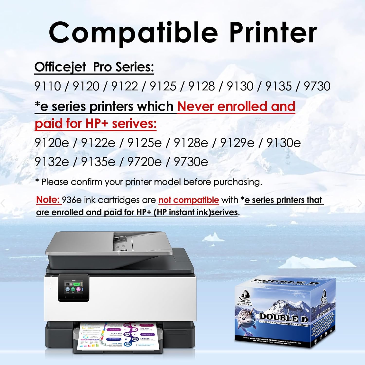 | Compatible Devices | Works with HP OfficeJet Pro 9110b, 9117b, 9120b, 9130b. Also compatible with e-series printers that have NEVER enrolled in or paid for HP+ (HP Instant Ink): 9120e, 9122e, 9125e, 9128e, 9129e, 9130e, 9132e, 9135e, 9720e, 9730e series |