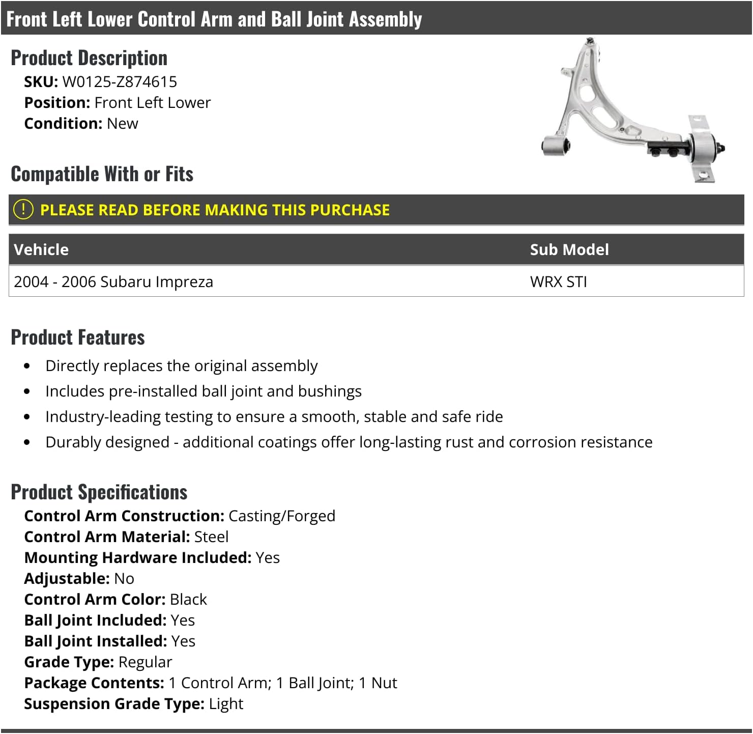 Front Left Driver Side Lower Control Arm with Ball Joint - Compatible with 2004 - 2006 Subaru Impreza WRX STIPosition: Front Left LowerPackage Contents: Front Left Driver Side Lower Control Arm with Ball JointCompatible With or Fits: - 2004 - 2006 Subaru Impreza WRX STI