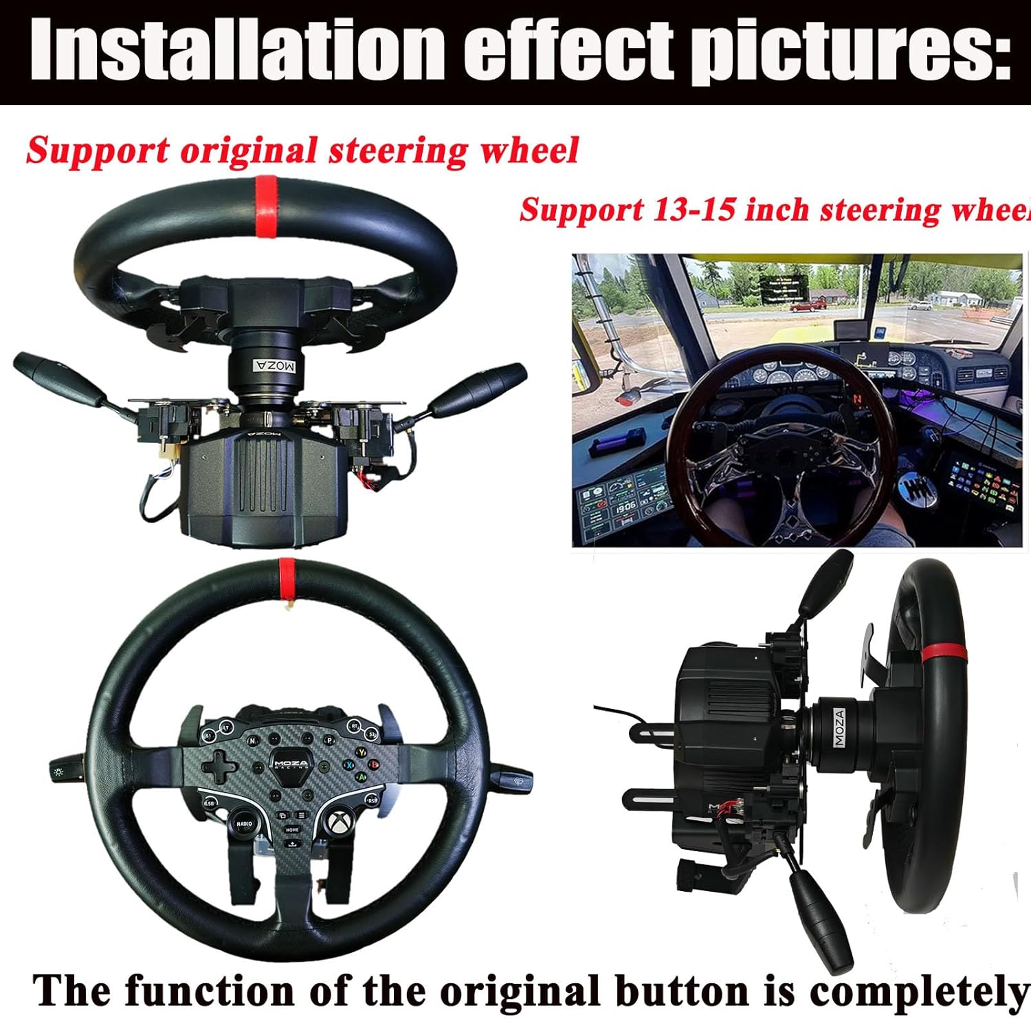 Supported Wheel Base Type: For MOZA R3/R5/R9 V2 Direct Drive Servo Wheel Base Supported steering wheel Type: For:For MOZA CS V2P/TSW Truck/RS V2/KS/GS/RSR F1/GT/ESX/Vison GS/FSR Racing Steering Wheel Product Fuction: 1.meter/Low beam switch,High beam/light switch 2.Three-speed variable wiper Product Features: 1.Support Auto-jump back of turning light lever 2.Cool Push Button of start 3.Real car driving experence 4.Support game Auto-Sync(No need to pause the game to adjust the position of the lever position when entering the game.) 5.Support original steering wheel installation 6.No need to install drivers-plug and play Package including: 1.Basic kit 2.Kit adapter and some screws Notes: The product does not include a gaming steering wheel.This is a game steering wheel modification kit used to increase the gaming experience.